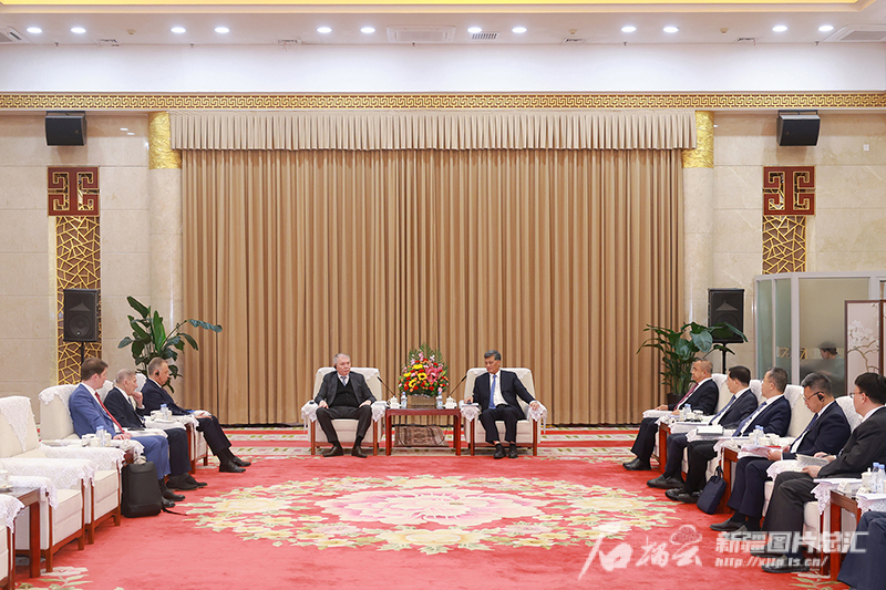 10月14日,自治区党委书记马兴瑞、自治区主席艾尔肯·吐尼亚孜在乌鲁木齐与俄共中央副主席,俄国家杜马独联体事务、欧亚一体化和俄侨联络事务委员会主席卡拉什尼科夫所率的工作组一行进行了友好交流。天山网-新疆日报记者 崔志坚摄