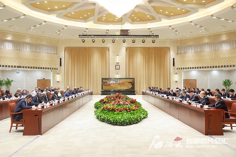 10月18日,自治区党委书记马兴瑞、自治区主席艾尔肯·吐尼亚孜在乌鲁木齐会见来新疆参访的伊斯兰合作组织代表团一行。天山网-新疆日报记者 崔志坚摄