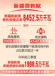 今年前三季度,新疆新增新能源装机规模1998.5万千瓦,其中风电装机642.3万千瓦,太阳能装机1356.2万千瓦,今年新增新能源装机规模位居全国第一。