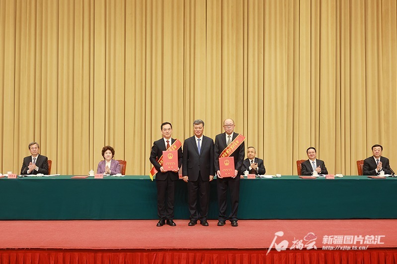 11月20日上午,新疆科技创新大会在乌鲁木齐召开。自治区党委书记、兵团党委第一书记、第一政委马兴瑞为获得自治区科学技术奖特等奖的中石油新疆油田分公司首席专家唐勇(右)和中国科学院新疆理化技术研究所研究员潘世烈颁奖。天山网-新疆日报记者 崔志坚摄