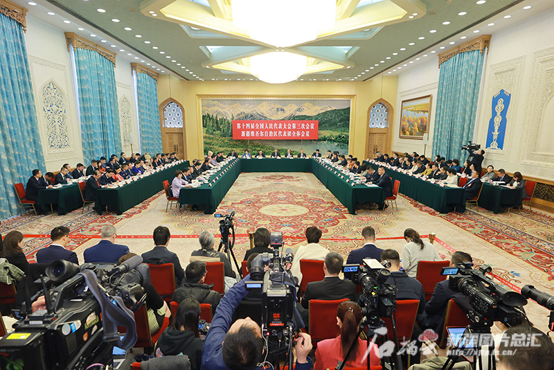 按照议程,新疆代表团首先审查两个报告。代表发言结束后,进入媒体提问环节,中外记者争相举手、踊跃提问。