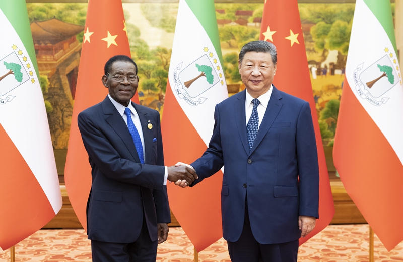 9月4日上午,国家主席习近平在北京人民大会堂会见来华出席中非合作论坛北京峰会的赤道几内亚总统奥比昂。新华社记者 翟健岚 摄