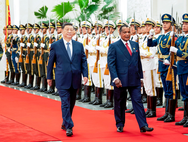 9月6日上午,国家主席习近平在北京人民大会堂同来华出席中非合作论坛北京峰会并进行国事访问的刚果(布)总统萨苏举行会谈。这是会谈前,习近平在人民大会堂北大厅为萨苏举行欢迎仪式。新华社记者 丁林 摄