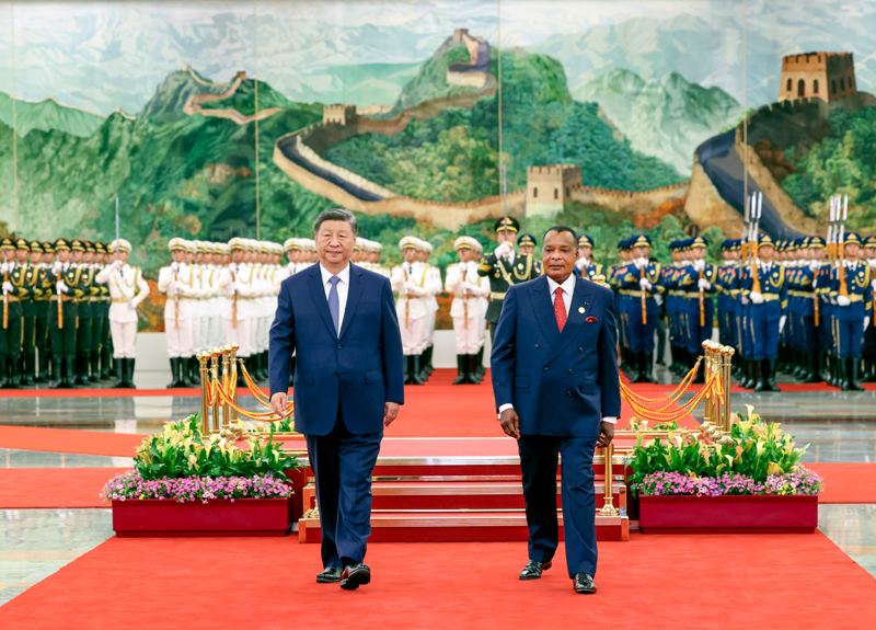 9月6日上午,国家主席习近平在北京人民大会堂同来华出席中非合作论坛北京峰会并进行国事访问的刚果(布)总统萨苏举行会谈。这是会谈前,习近平在人民大会堂北大厅为萨苏举行欢迎仪式。新华社记者 翟健岚 摄
