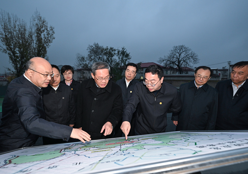 11月13日,中共中央政治局常委、国务院总理李强在河北调研。这是李强在涿州市小清河分洪区南围堤建设工程现场,察看项目最新进展,听取河北省灾后重建重大水利工程等情况汇报,与设计施工监理人员交流。新华社记者 饶爱民 摄