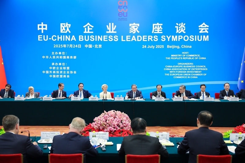 新华社北京7月24日电(记者冯歆然)国务院总理李强7月24日下午在北京人民大会堂同欧盟委员会主席冯德莱恩共同出席中欧企业家座谈会。近60位中欧商会和企业负责人出席。
