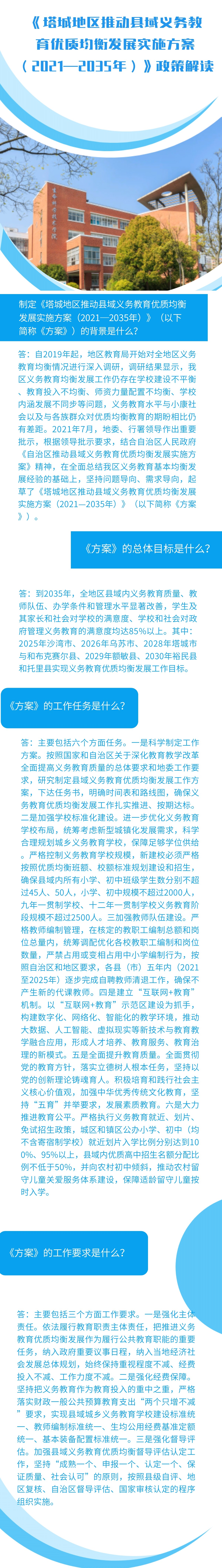 《塔城地区推动县域义务教育优质均衡发展实施方案(2021─2035年)》政策解读 2022-01-05 13:07:52 点击:[] 打印 分享到: 策解读主体:地区教育局政策解读责任人:第一责任人:谢丽(地区教育局党组书记)日常解读人:夏芳(地区教育局教育综合(基础教育科科长)联系电话:0901—6220389相关文件:关于印发塔城地区推动县域义务教育优质均衡发展实施方案(2021—2035年)的通知 相关内容 关于印发塔城地区推动县域义务教育优质均衡发展实施方案(2021—2035年)的通知 【关闭】