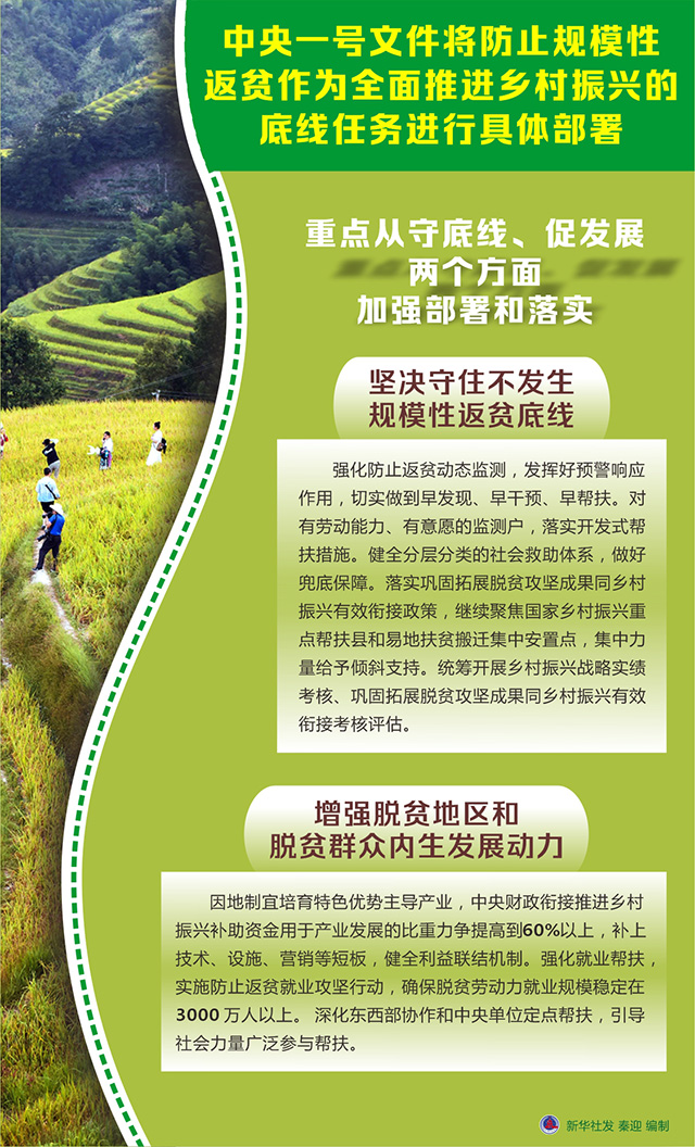 图表:中央一号文件将防止规模性返贫作为全面推进乡村振兴的底线任务进行具体部署 2023-02-17 11:36:50 点击:[] 打印 分享到: 新华社2月13日受权发布《中共中央 国务院关于做好2023年全面推进乡村振兴重点工作的意见》。这是新世纪以来指导“三农”工作的第20个中央一号文件。中央农村工作领导小组办公室主任、农业农村部部长唐仁健当天就文件精神进行了全面解读。新华社发 秦迎 编制 相关内容 相关文件:《中共中央 国务院关于做好2023年全面推进乡村振兴重点工作的意见》 【关闭】