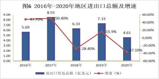 全年外贸进出口总额完成4.61亿美元,比上年下降37.1%。其中,进口0.14亿美元,下降75%;出口4.47亿美元,下降34%。货物进出口顺差(出口减进口)4.33亿美元。