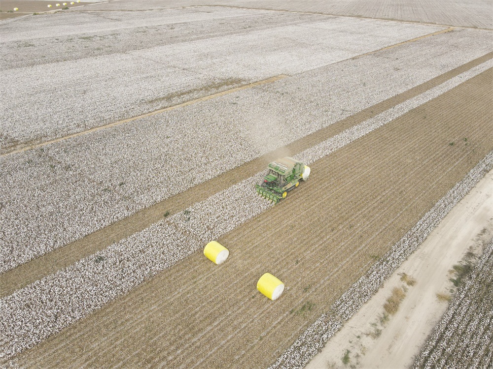□沙湾市大泉乡双泉合作社在机采棉花。本报记者宋建亮摄