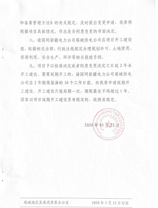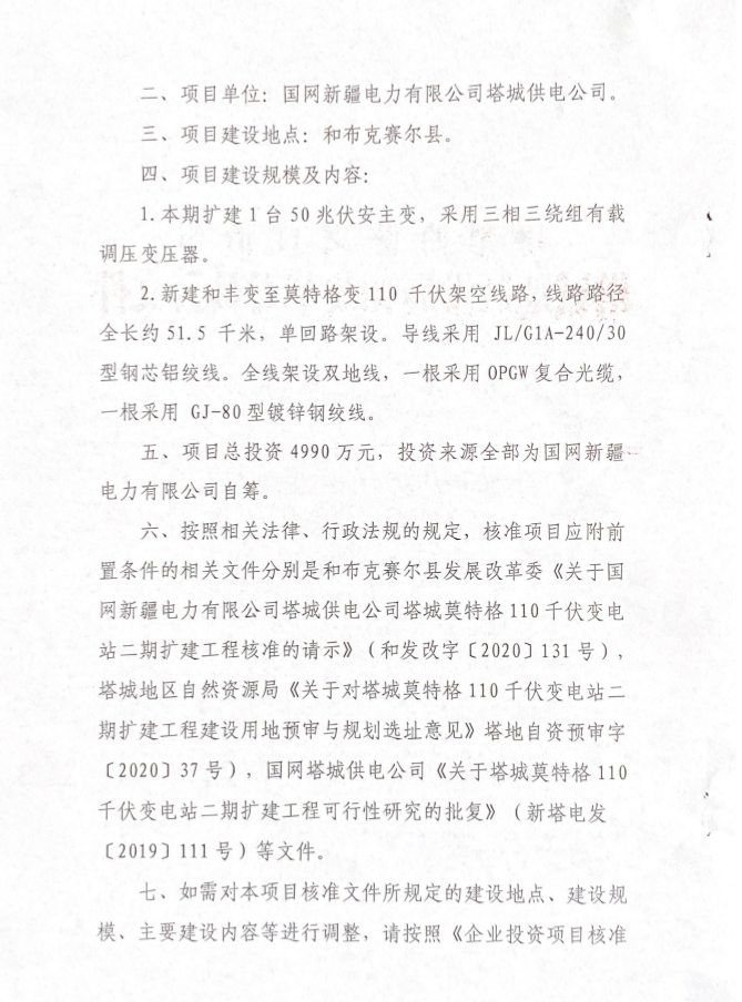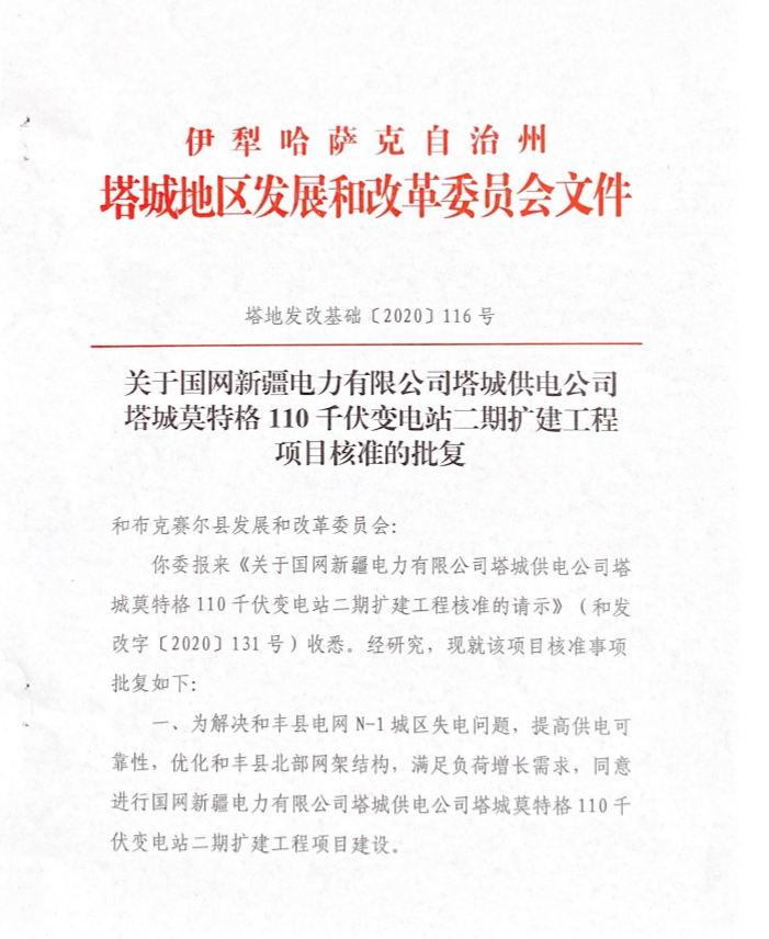 关于国网新疆电力有限公司塔城供电公司塔城莫特格110千伏变电站二期扩建工程项目核准的批复