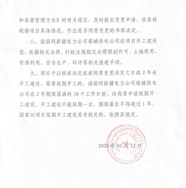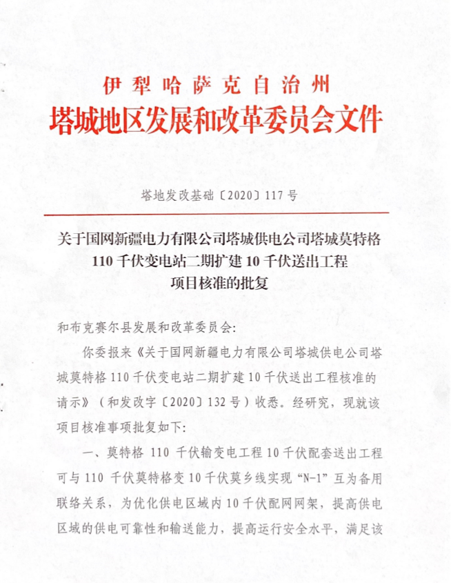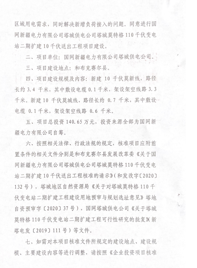 关于国网新疆电力有限公司塔城供电公司塔城莫特格110千伏变电站二期10千伏送出工程项目核准的批复