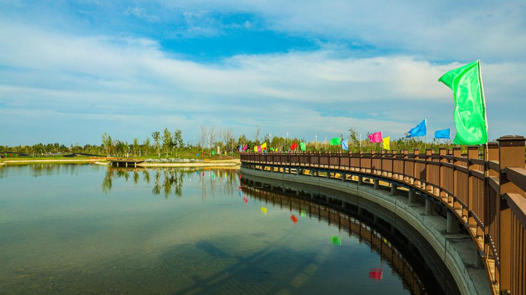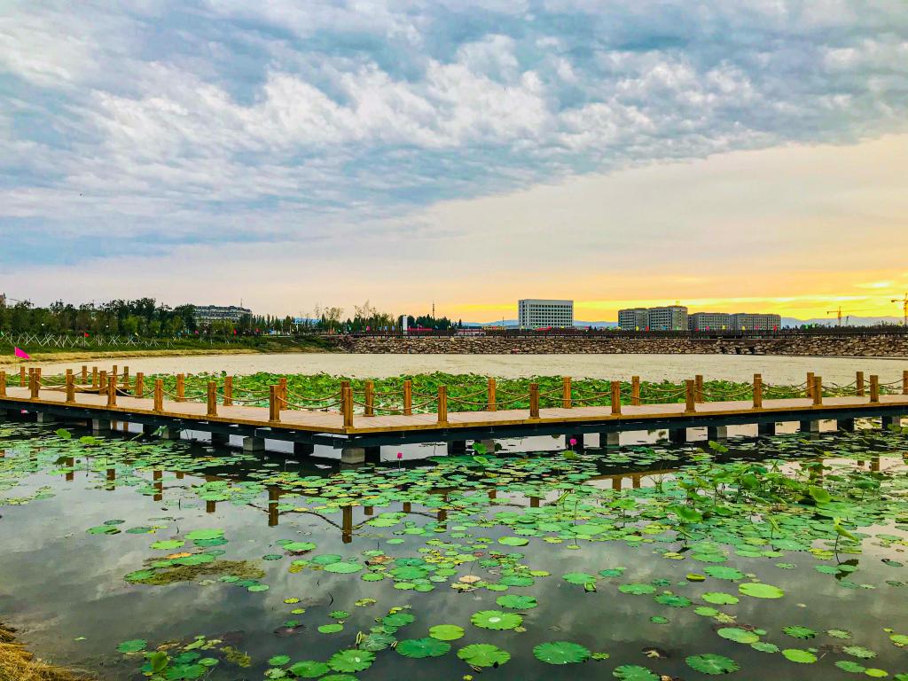 ---【文旅产业园(千泉湖)】园区千泉湖水面面积约320亩,依据地形、地势营造不同的湖水景观,有观赏性的深水湖区、有亲水性的浅水区,通过造型各异的拦水坝营造风格迥异的湖水景观。