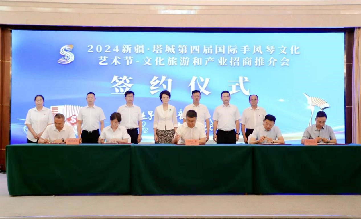 新疆塔城市近日召开2024新疆·塔城第四届国际手风琴文化艺术节-文化旅游和产业招商推介会。在签约环节,共签订项目11项,签约总金额15.29亿元,项目主要涉及建材生产、文化旅游、房地产开发、农副产品加工等产业领域。