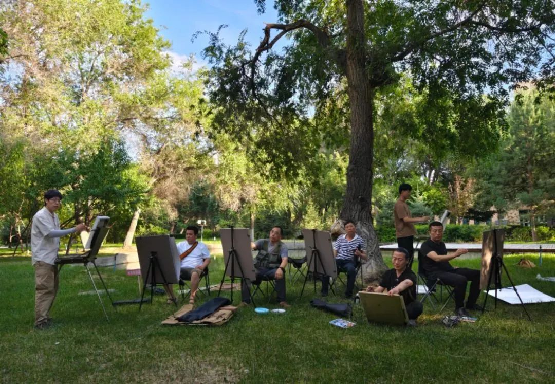 职业画家、新文艺群体代表王晓天在裕民县人民公园创作。 王晓天:这是我首次来到新疆,感到十分荣幸。在塔城红楼笔会活动中,我把对绘画艺术的理解、经验全都传递给当地书画爱好者,以此来提高当地民众的绘画艺术水平。 我将以体现“民族团结,辽塔一家亲”为主题创作。作品会穿插民族特色、地域风景等元素。争取创作出更多体现塔城地区多民族融合的美术作品,为推动辽宁文化润疆、铸牢中华民族共同体意识作出贡献。