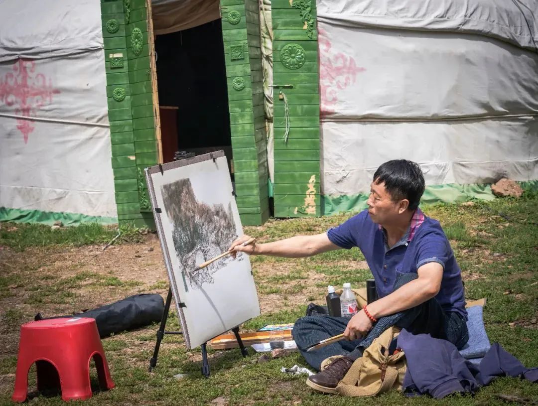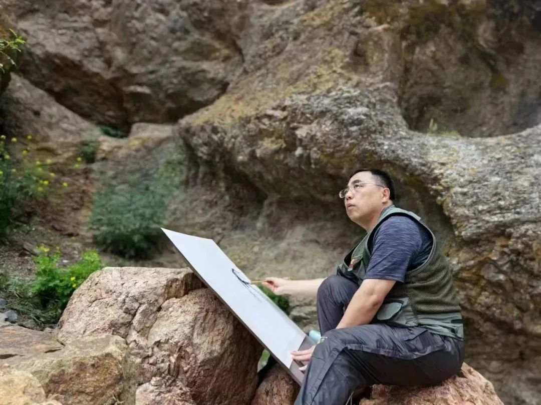 职业画家、新文艺群体代表李泽在塔城市塔尔巴哈台山创作。 李泽:记得当飞机刚刚降落塔城机场,画家们的创作热情就已高涨起来。晚饭后,我们美术创作组展纸研墨,提笔共绘《锦绣边关映绿霞》画作直至深夜。画面中,天山脚下繁花锦簇,青松环抱,一片生机。正如我们各民族同胞欢聚一起,呈现出欣欣向荣的景象,彰显了“文化润疆 辽塔情缘”的主题内涵。 在十多天的行程中,我们深入生活采风走访,了解人文历史,听取塔城地区的前世今生。感叹和平盛世的同时,又对老一辈革命人的艰辛创业精神肃然起敬。站在发黄的老照片面前,被那翻天覆地的变化所震撼。采风创作时,我对景落墨、直抒胸臆、记录情感,不知不觉中已有10余幅写生小品。我会精挑细选一些美术作品,参加下半年在沈阳举办的展览。