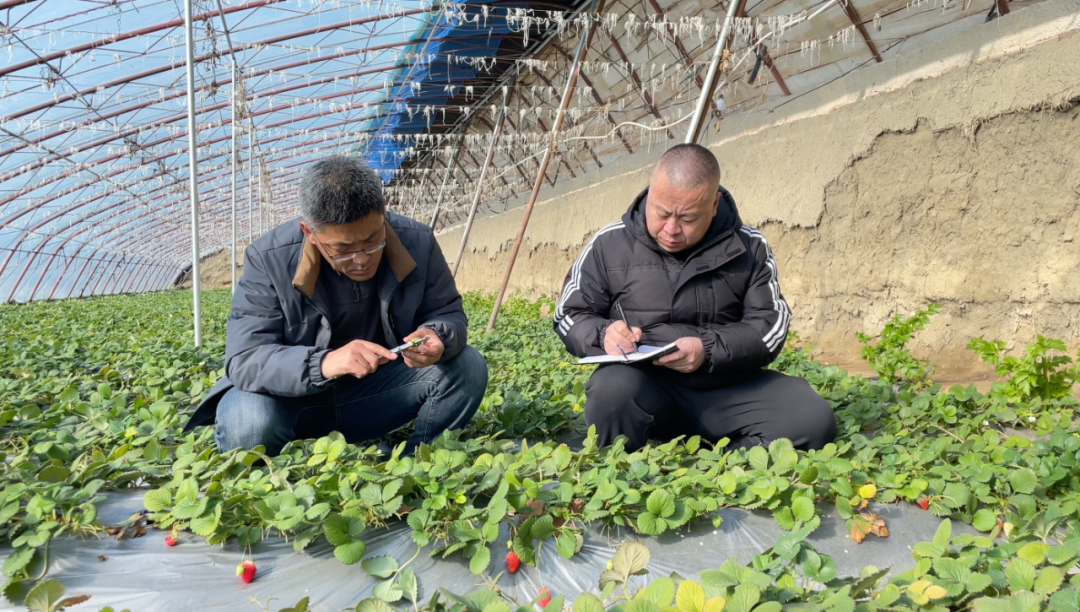 王志刚与同事一起测量草莓甜度、大小和生长情况。