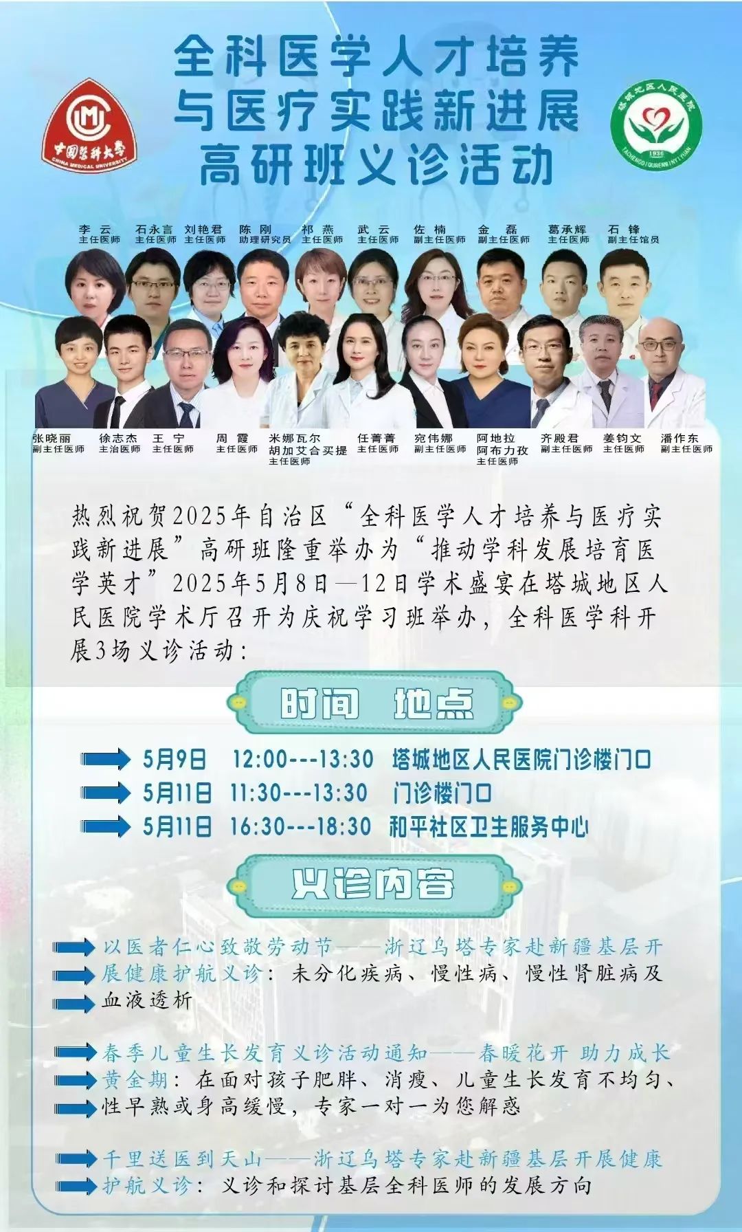 2025年自治区“全科医学人才培养与医疗实践新进展”高研班将于2025年5月8日—12日在塔城地区人民医院学术厅召开。为庆祝学习班举办,全科医学科将开展义诊活动: