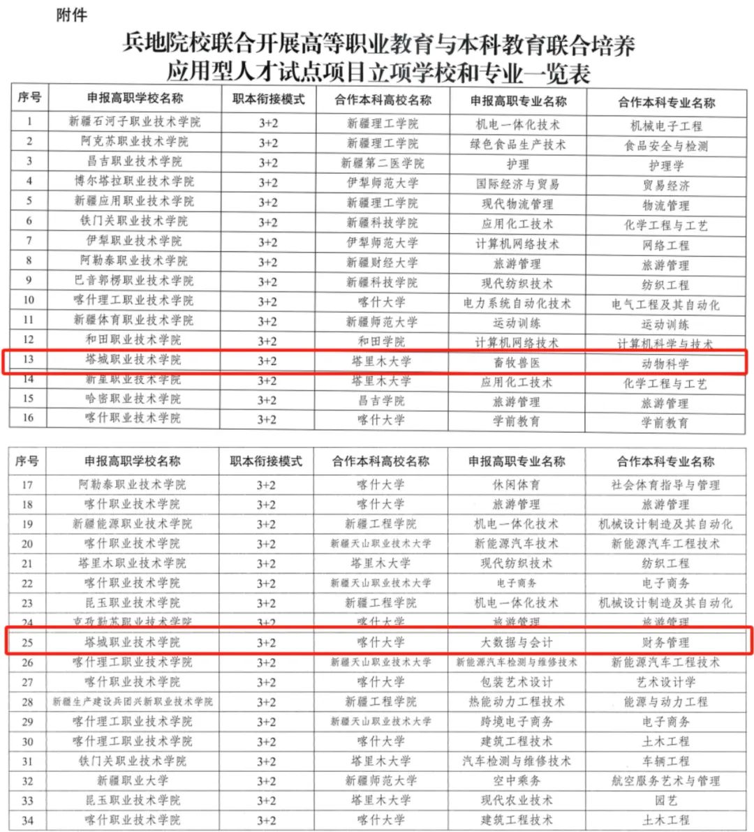 据了解,5月12日,自治区教育厅和生产建设兵团教育局联合发布了《关于公布兵地院校联合开展高等职业教育与本科教育联合培养应用型人才试点项目立项学校和专业的通知》,塔城职业技术学院首次申报的与塔里木大学联合培养应用型人才试点“畜牧兽医‘3+2’”模式和与喀什大学联合培养应用型人才试点“大数据与会计‘3+2’”模式成功获批。