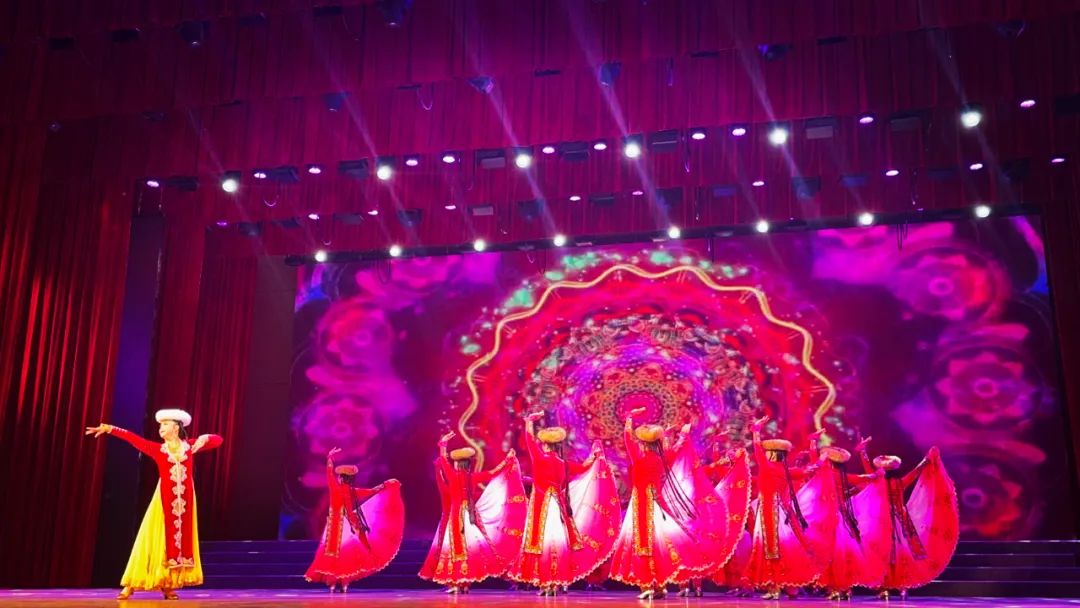 随着乌孜哈勒木卡姆那动人的旋律响起,塔城地区的舞者们身着绚丽多彩、充满维吾尔族特色的服饰闪亮登场。他们的服饰上绣着精美的图案,每一针每一线都诉说着维吾尔族的历史与文化。舞者们头戴皮草圆顶帽,身着飘逸的长裙,裙摆随着舞动飞扬起来,仿佛盛开的花朵。