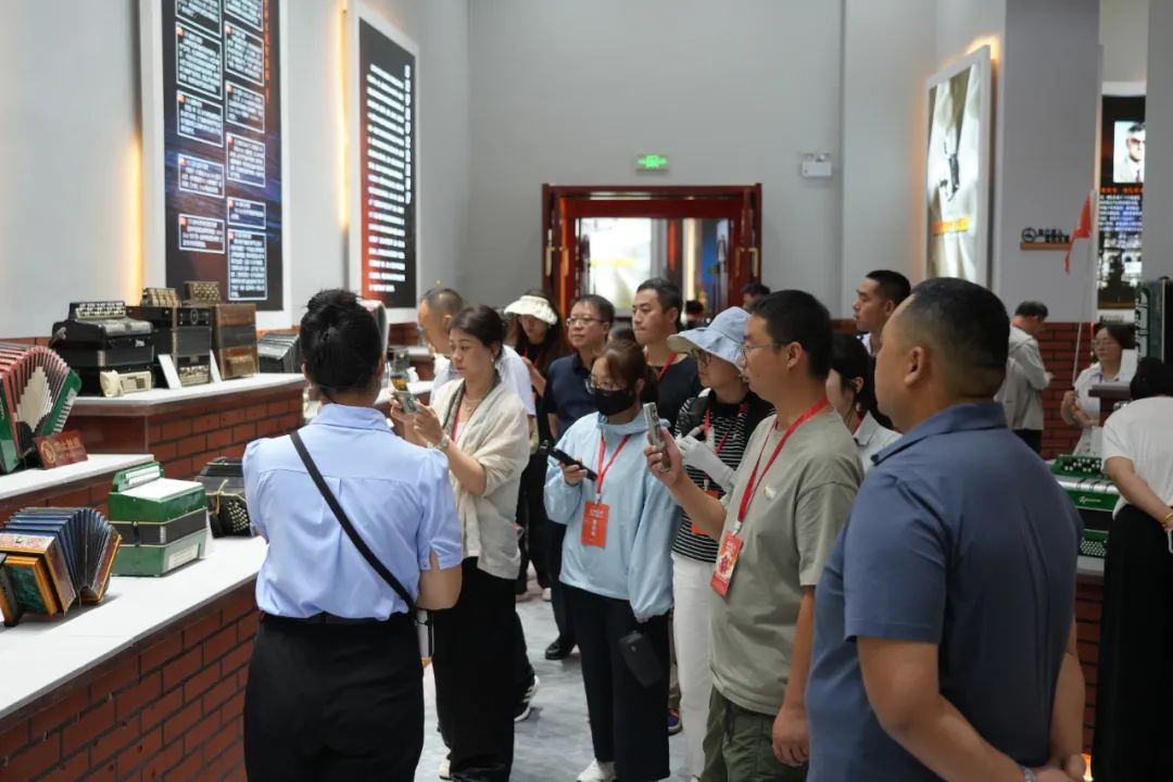 媒体采访团在塔城市手风琴文化展厅参观。塔城地区融媒体中心记者马合巴勒·木尔扎汗摄