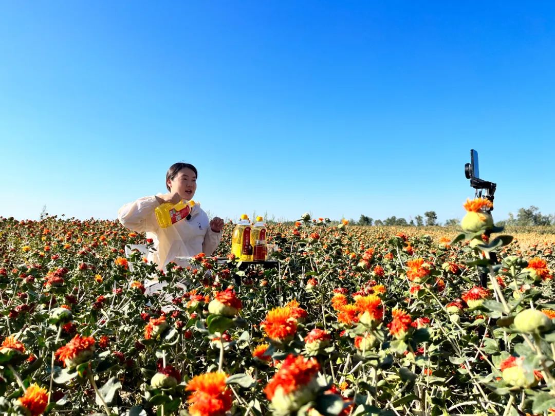 盛夏的巴尔鲁克山脚下,连片的红花田正泛起层层金浪。近日,裕民县文广旅局联合巴尔鲁克甄选电子商务有限公司,将直播间“搬”进红花地头,镜头前,工作人员手持桶装红花籽油,向屏幕另一端的网友娓娓道来:“咱们的红花籽油经过冷榨工艺处理,保留了最高活性成分.......”。