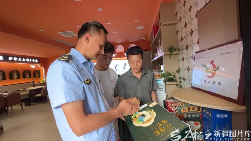 7月30日,沙湾市市场监督管理局干部与沙湾市盛泽畜牧科技有限公司工作人员指导餐饮店应用沙湾大盘鸡质量追溯系统。特来克·木哈买提江 摄