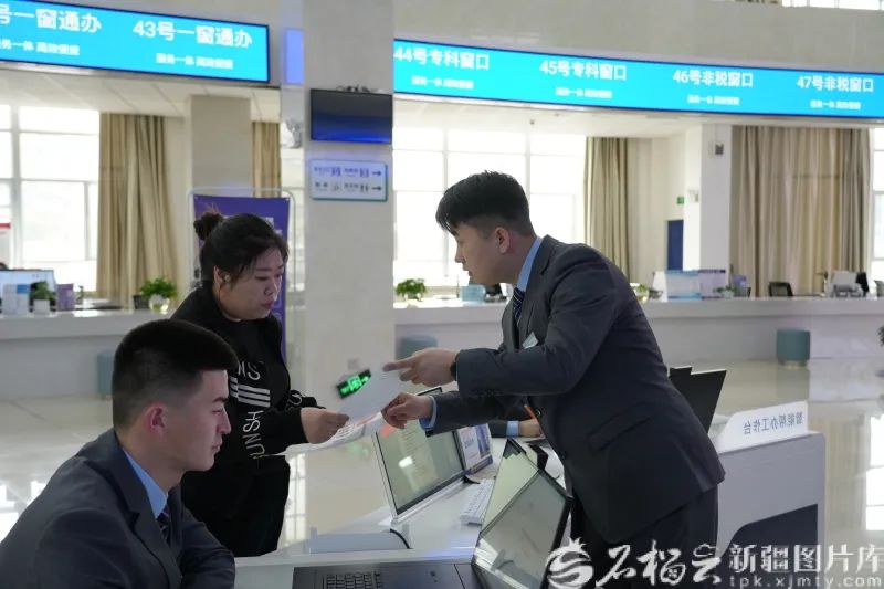 塔城地区政务服务与公共资源交易中心工作人员为群众办理业务。马合巴勒·木尔扎汗 摄