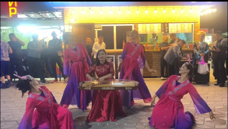 活动在一首《盛世国乐》中拉开帷幕,如天山雪水奔流,迅速吸引现场观众驻足。四位舞者翩然入场,琴舞和鸣,瞬间点燃湖畔艺术氛围。随后,女声独唱《玛依拉》以轻快活泼的节奏、灵动俏皮的表演,展现出草原与绿洲交融的生机;小合唱《茉莉花》则用温柔婉转的和声,传递出中华文化的典雅与包容。