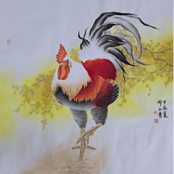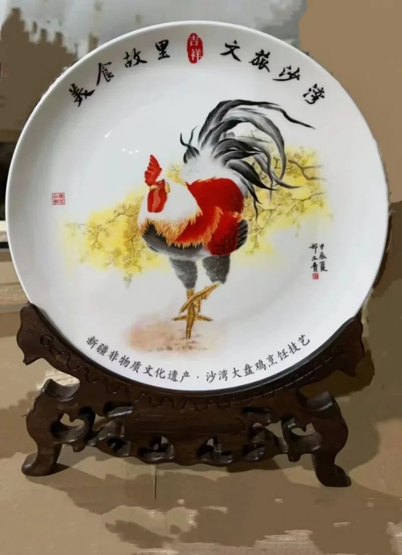 魏宝山院长匠心独运,将国画之美与景德镇瓷器的细腻完美融合。盘子上,一只雄鸡跃然瓷面,羽翼斑斓,眼神中透露出不屈的傲骨与无尽的活力。这不仅仅是一幅画作,更是对沙湾大盘鸡精神的深刻诠释——吉祥、勇敢、力量,与大盘鸡那豪迈不羁、热情四溢的味道不谋而合,让人在品味美食的同时,也能感受到艺术的熏陶。