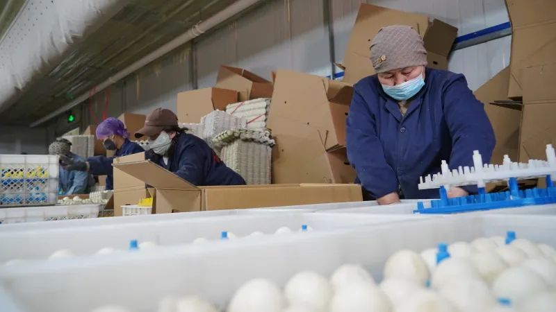 在鸭蛋分拣车间里,十几位职工正麻利地将一筐筐鸭蛋打包装箱,目前百福升所生产的鸭蛋每日多达几十万枚,经过专门的物流通道,销往各个省市。