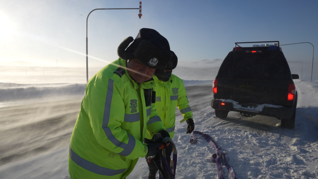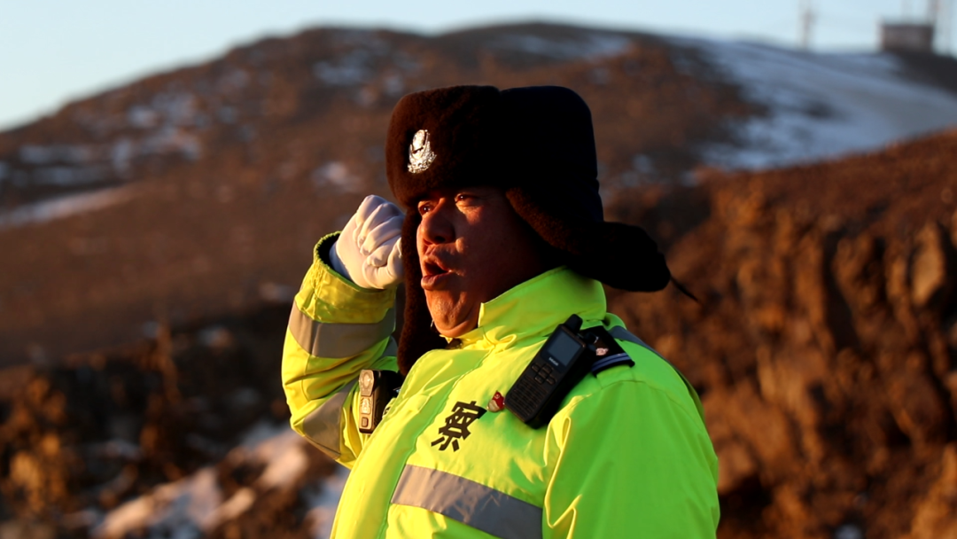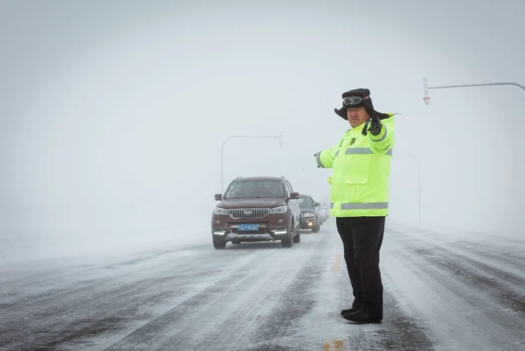 丁永刚在风雪弥漫的道路上执勤,在恶劣天气保障交通秩序的场景。