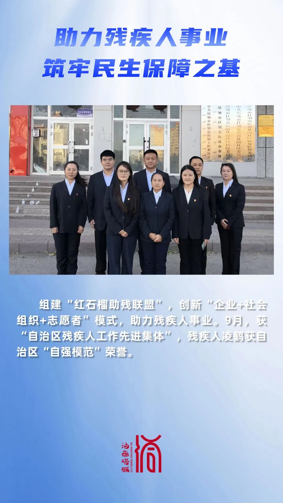 组建“红石榴助残联盟”,创新“企业+社会组织+志愿者”模式,为残疾人搭平台、建舞台,助力残疾人事业,以“民生无小事,高效办实事”为核心理念,构建起覆盖全领域的民生服务体系,用速度与温度书写了新时代基层服务的典范答卷。9月,获“自治区残疾人工作先进集体”,残疾人凌鹤获自治区“自强模范”荣誉。