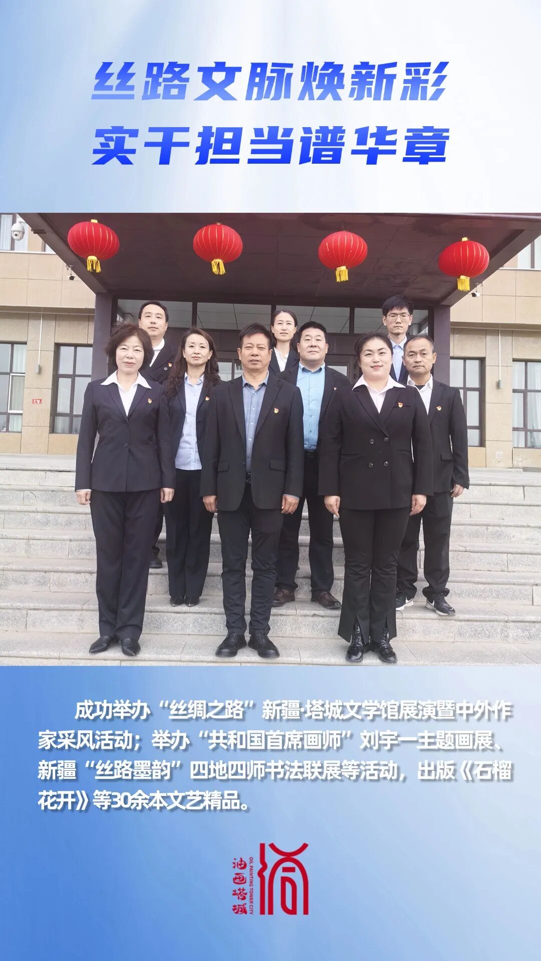 成功举办“丝绸之路”新疆·塔城文学馆展演暨中外作家采风活动;先后2次承办全疆文联工作会议;举办“共和国首席画师”刘宇一主题画展、新疆“丝路墨韵”四地四师书法联展等活动;举行中央音乐学院新时代文明实践塔城基地、中央音乐学院手风琴表演与教学实践基地揭牌暨文艺小分队来塔演出活动;出版《石榴花开》等30余本文艺精品。