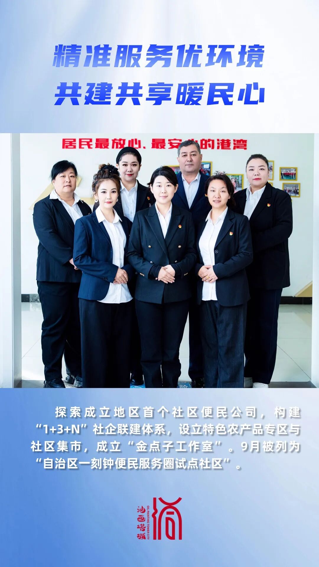 探索成立地区首个社区便民公司,盘活闲置资源,推动社区“造血”。构建“1+3+N”社企联建体系,优化营商环境,精准服务企业140次,解决难题38个;深化村社联建,设立特色农产品专区与社区集市,年销售额超300万元,助农节约成本20万元,为3个村增收近14万元;成立“金点子工作室”,解决急难愁盼427件。9月被列为“自治区一刻钟便民服务圈试点社区”。