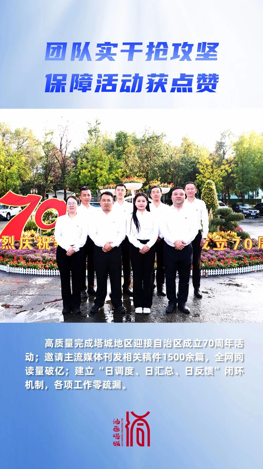 组建专业队伍、精细打磨点位、高效服务保障,高质量完成塔城地区迎接自治区成立70周年活动;坚持“全区布置+要素运用+多点报道”,城市面貌焕然一新,邀请主流媒体刊发相关稿件1500余篇,全网阅读量破亿;始终保持“战时工作模式”,建立“日调度、日汇总、日反馈”闭环机制,各项工作零疏漏。