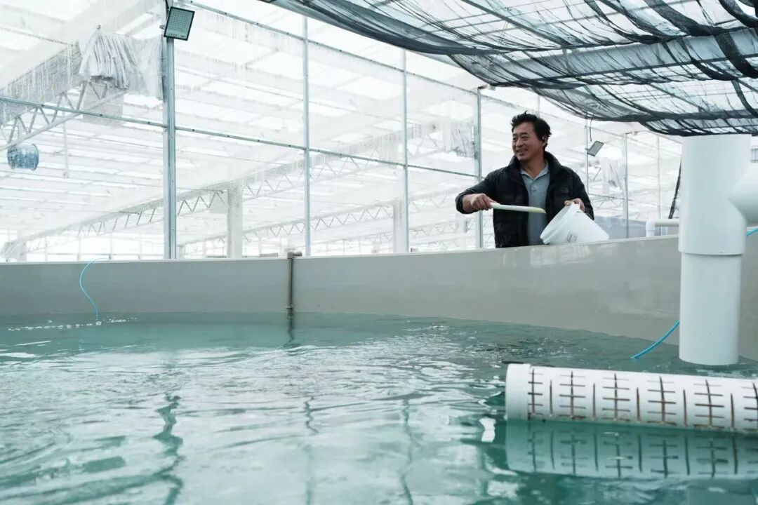新疆乐昊农业科技有限公司技术总监陈义锋正在为鱼投放鱼饲料。