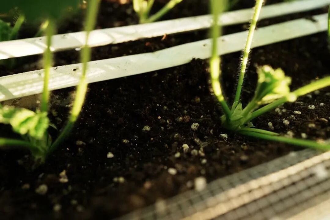 草莓植株下的土壤里藏着珍珠岩、草炭土、蛭石等栽培基质。