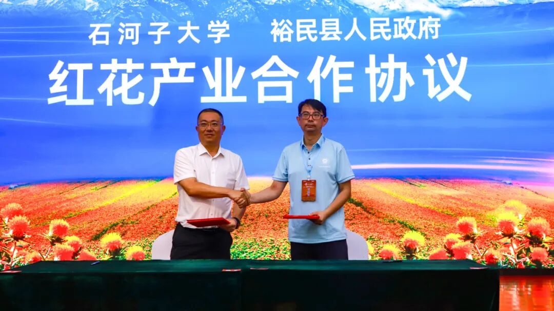 合作签约环节中,裕民县人民政府与石河子大学红花产业研究院达成红花产业合作协议。
