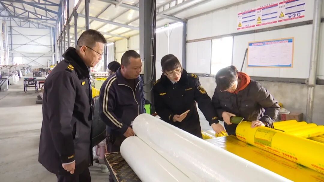 沙湾市市场监督管理局工作人员检查地膜厂生产车间。