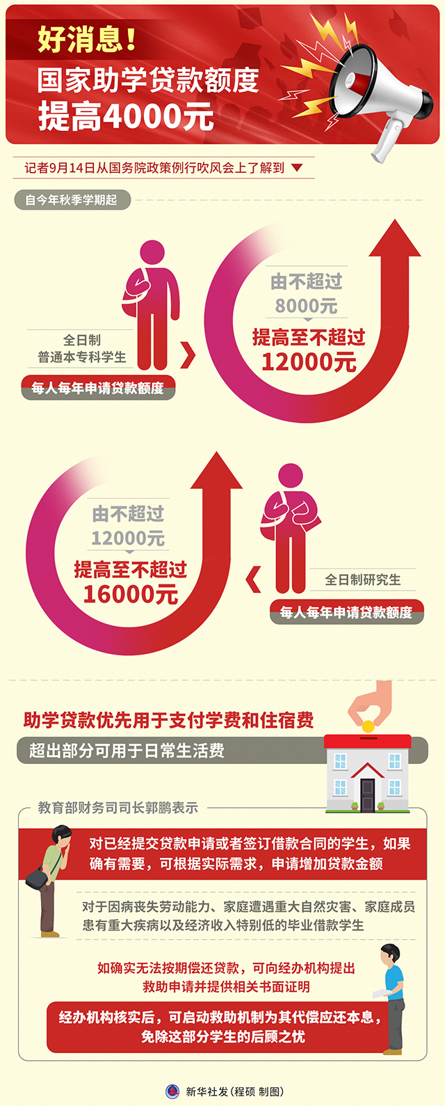 图表:好消息!国家助学贷款额度提高4000元 2021-09-23 11:39:18 点击:[] 字体:小 大 记者9月14日从国务院政策例行吹风会上了解到,自今年秋季学期起,全日制普通本专科学生每人每年申请贷款额度由不超过8000元提高至不超过12000元;全日制研究生则由不超过12000元提高至不超过16000元。新华社发 程硕 制图 相关内容 相关文件:《关于进一步完善国家助学贷款政策的通知》