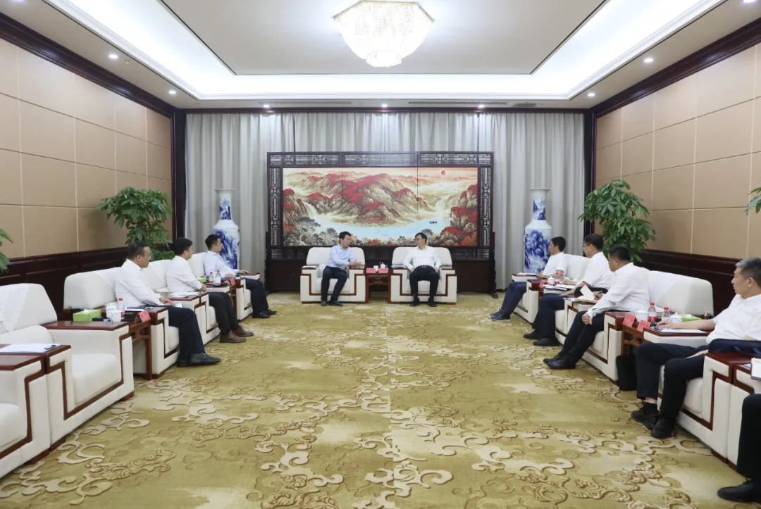 6月26日,地委书记支现伟与金开新能源股份有限公司党委书记、董事长尤明杨一行座谈。塔城地区融媒体中心记者苏珊琳摄
