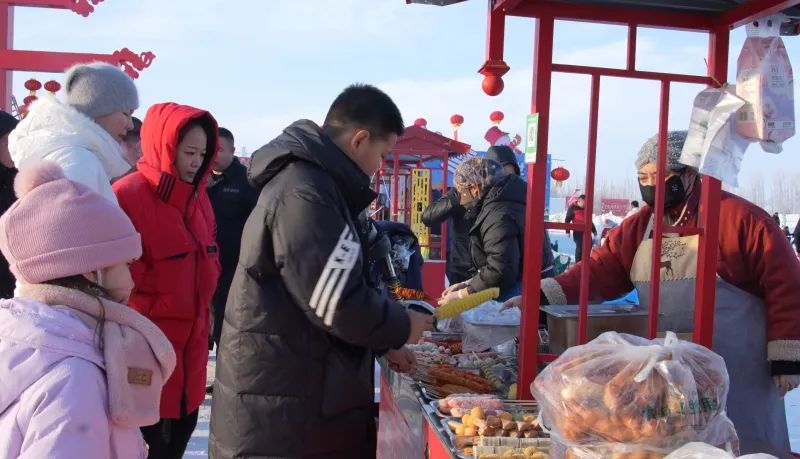 除了丰富有趣的冰雪娱乐项目,现场还设有农副产品、特色美食展销会区域,游客们可以在玩乐中尽情品尝地道美食,选购特色农产品。