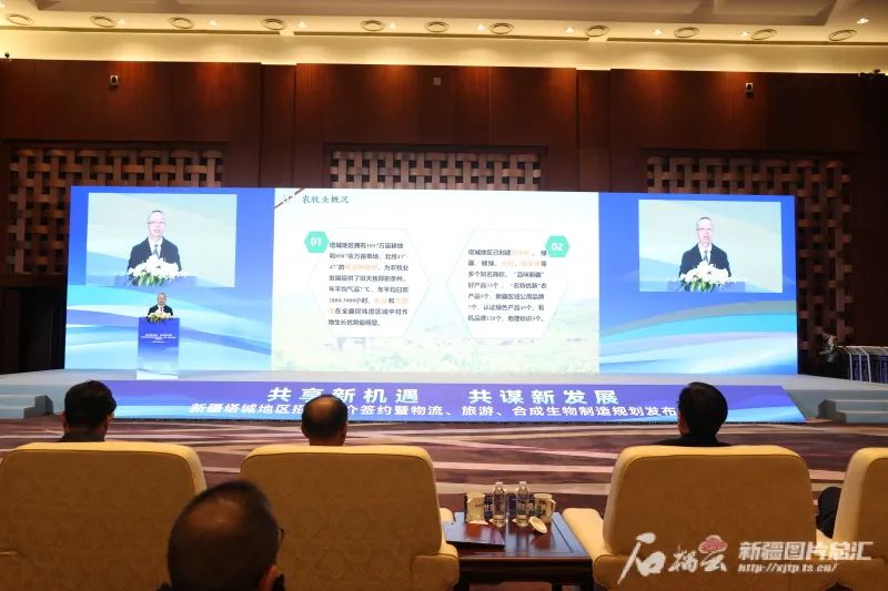 1月14日,在塔城地区招商推介签约暨物流、旅游、合成生物制造规划发布会上,塔城地区农业农村局党组书记张国栋进行推介。李霞 摄