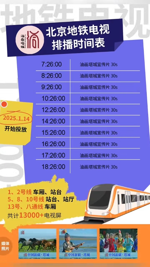 日均覆盖1200万人次!油画塔城宣传片在北京地铁电视滚动播出 2025-01-17 11:08:39 塔城零距离 点击:[] 打印 分享到: 在北京地铁一抹来自远方的艺术气息正悄然弥漫油画塔城 宣传片正在北京地铁电视滚动播出为乘客们带来一场视觉与心灵的双重盛宴塔城,一个被大自然深情厚爱的地方每一寸土地都仿佛是大自然精心绘制的油画北京地铁1/2/5/8/10/13/八通线共计13000+电视屏日均覆盖1200万人次北京地铁电视排播表 【关闭】