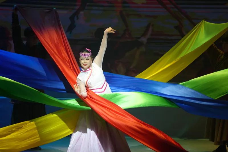 舞台舞美设计独具匠心,融合现代新型元素,彩绸舞、彩带舞交织成中国结、同心结等多种形式与图案,生动展现了新疆多民族文化。观众仿佛穿越时空,身临其境般置身于宝木巴草原的传奇世界。