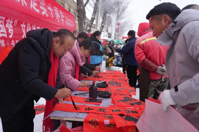 活动现场,塔城地区科协、文联等部门有关工作人员共同创作蕴含国家安全元素的春联内容,书法志愿者书写春联与“福”字,现场一派欢乐祥和的节日氛围。