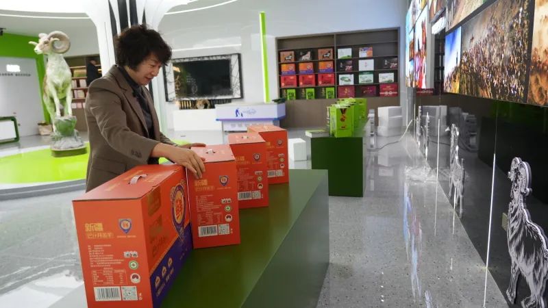 工作人员在展厅摆放产品。塔城地区融媒体中心记者王高升摄