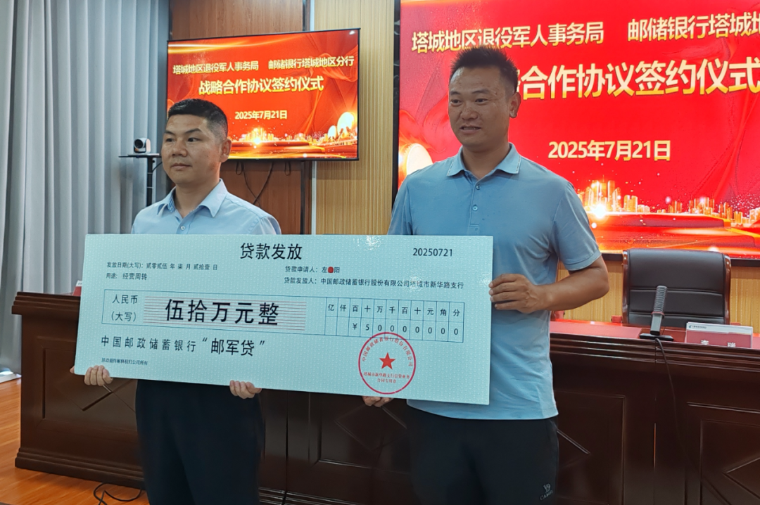 在签约仪式上,邮政储蓄银行塔城地区分行以构建“银行+退役军人”协同服务新模式,为退役军人等相关人员推出专属的金融信贷产品“邮军贷”,帮助退役军人了解邮政银行金融产品,获得金融支持。当日,邮政储蓄银行塔城地区分行为退役军人成功办理了首笔50万元的“邮军贷”业务。