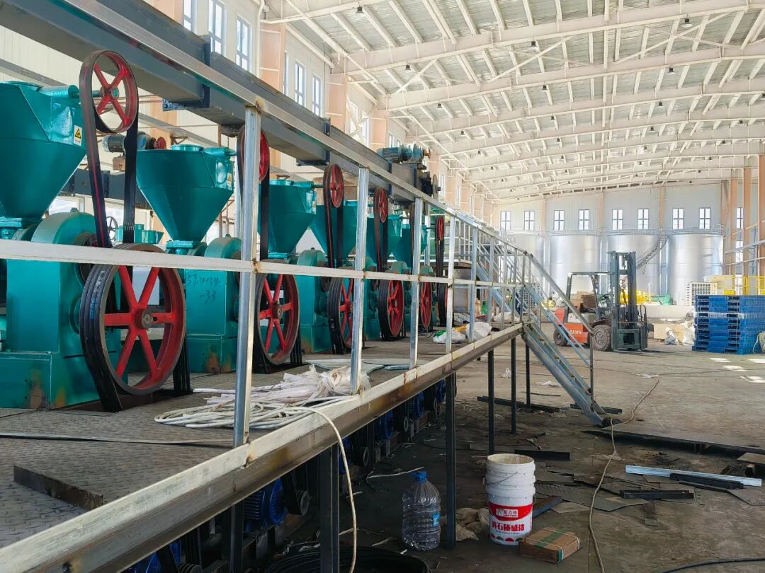 新疆青耕国际商贸有限公司进口油料加工生产线在安装调试中。